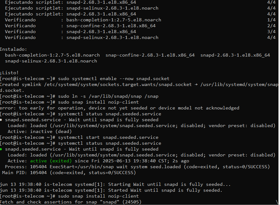 Si te marca error verifica el servicio snap con systemctl status snapd.seeded.service si el servicio está inactivo, hablitalo con systemctl start snapd.seeded.service