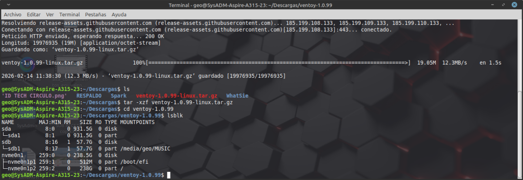 Descargamos ventoy desde el CLI con: wget https://github.com/ventoy/Ventoy/releases/download/v1.0.99/ventoy-1.0.99-linux.tar.gz